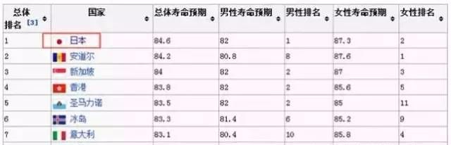 世界卫生组织(WTO)发布的2015年版《世界卫生统计》报告显示,2014年日本女性的平均寿命为86.83岁,男性为80.50岁,均刷新了历史最高记录。日本人的平均寿命连续20多年位居世界第一。